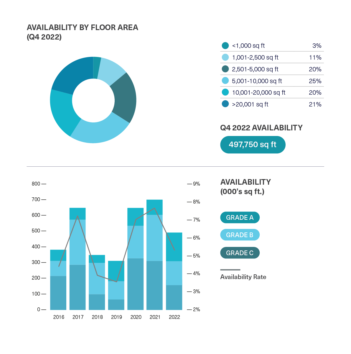 Supply continued to tighten, falling below 2.5m sq ft in the final quarter of the year and is now at its lowest level since Q2 2020. Total space on the market at the end of Q4 was down to 2.48m sq ft, with Grade A supply remaining at under 1m sq ft for the second successive quarter. There remains a shortage of larger buildings on the market, with only 595,210 sq ft of buildings able to accommodate requirements of 20,000 sq ft and above. The availability rate is now below the long run average (6.0%) at 4.9%.