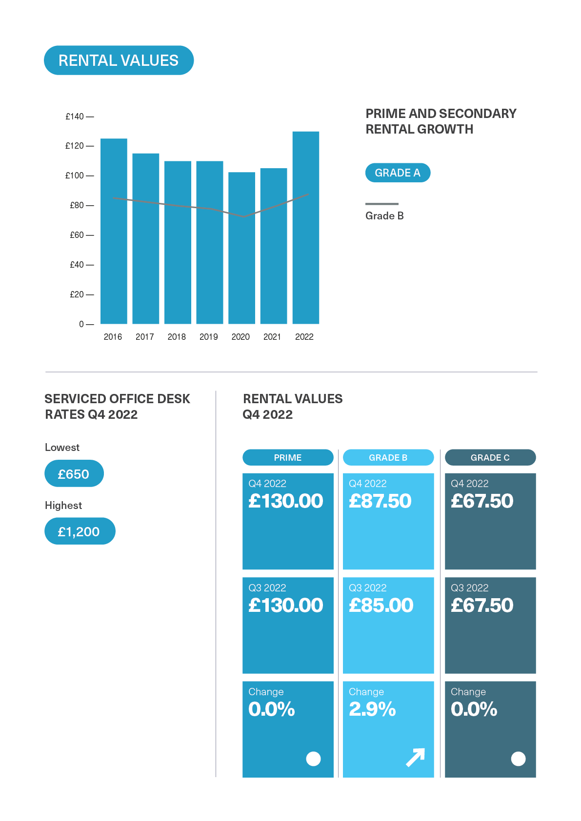 Prime rents moved back to their 2015 peak level of £135.00 per sq ft, an increase of 17.4% on the year. Rents on Grade B and Grade C space grew at a slower rate, rising by 8.8% and 6.7% to £92.50 per sq ft and £69.50 per sq ft respectively.